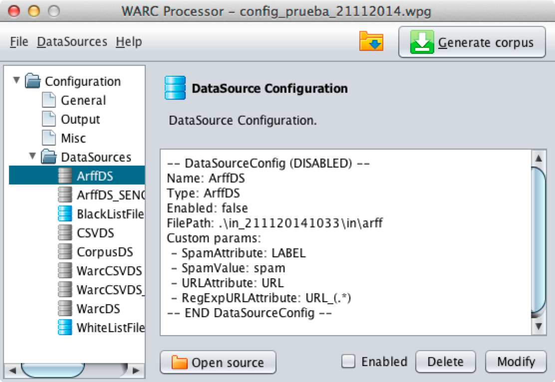 - Selection of input Datasources: Datasources can be easilly enabled or disabled with the purpose of include/exclude them in the output corpus generation.