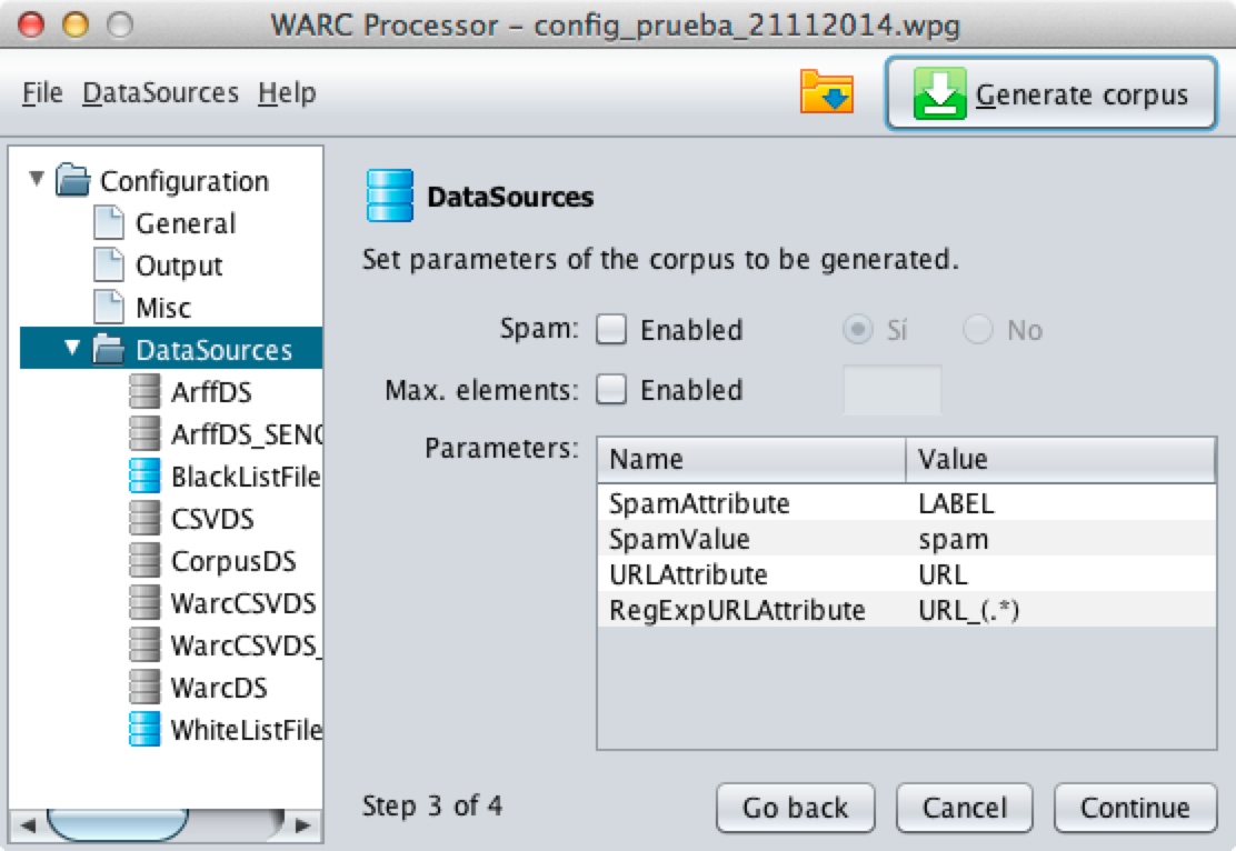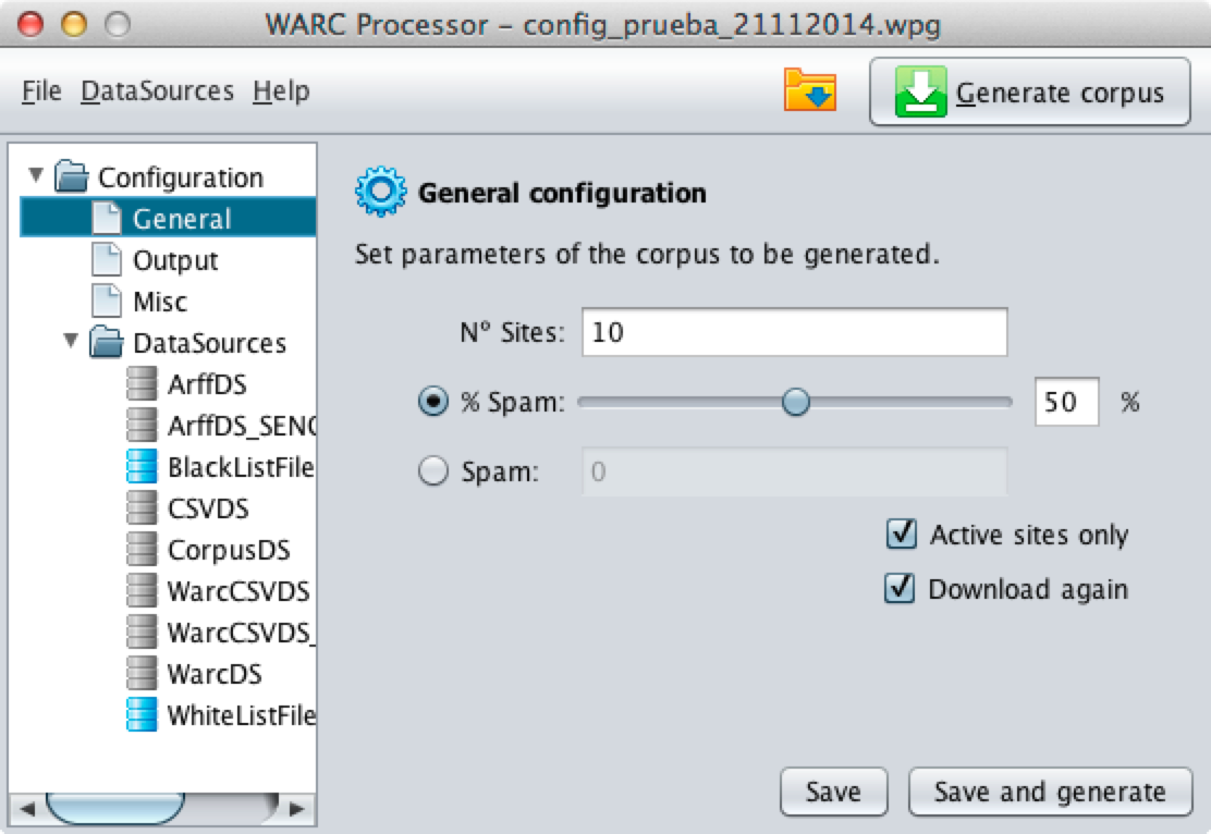 General configuration allows stablishing the number of sites to include in the output corpus as well as the percentage of spam sites or a fixed number of spam instances.