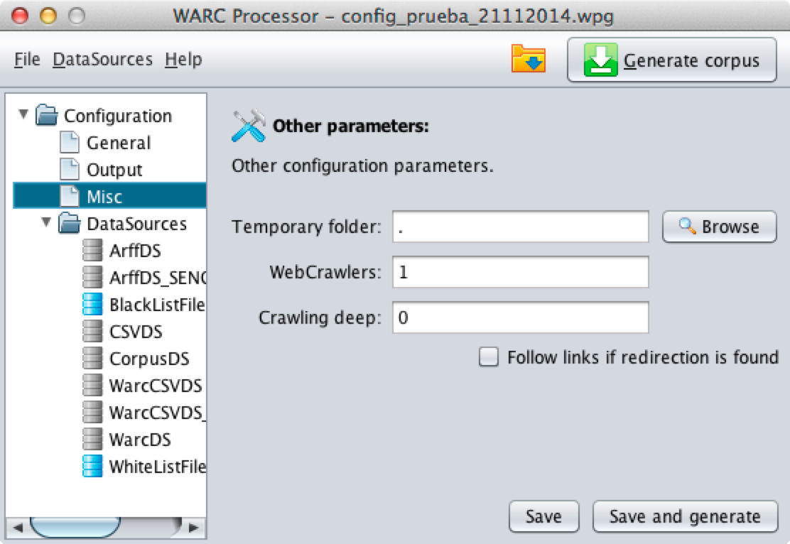 Finally, Misc configuration contains internal parameters for the operation of WARCProcessor app. The parameters include a temporary folder, the number of threads for the web-crawler, the deep of site scanning (0 infinite) and if a redirection should be followed when found in the main site.