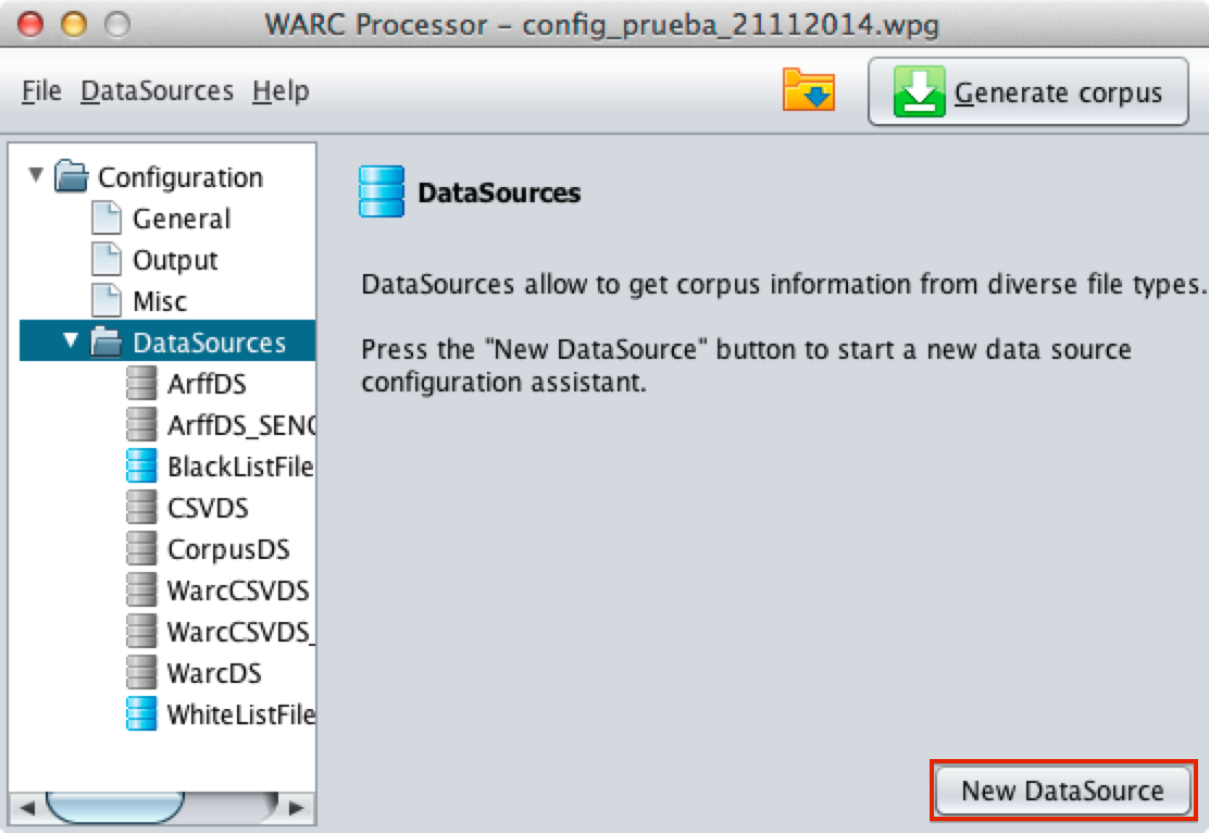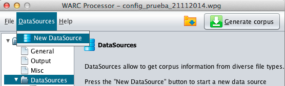 This tutorial will guide you through all the steps needed to (i) add new data sources to WARCProcessor, (ii) understand all kind of datasources and their parameters, (iii) configure the properties of output corpora and finally, (iv) build your corpora.