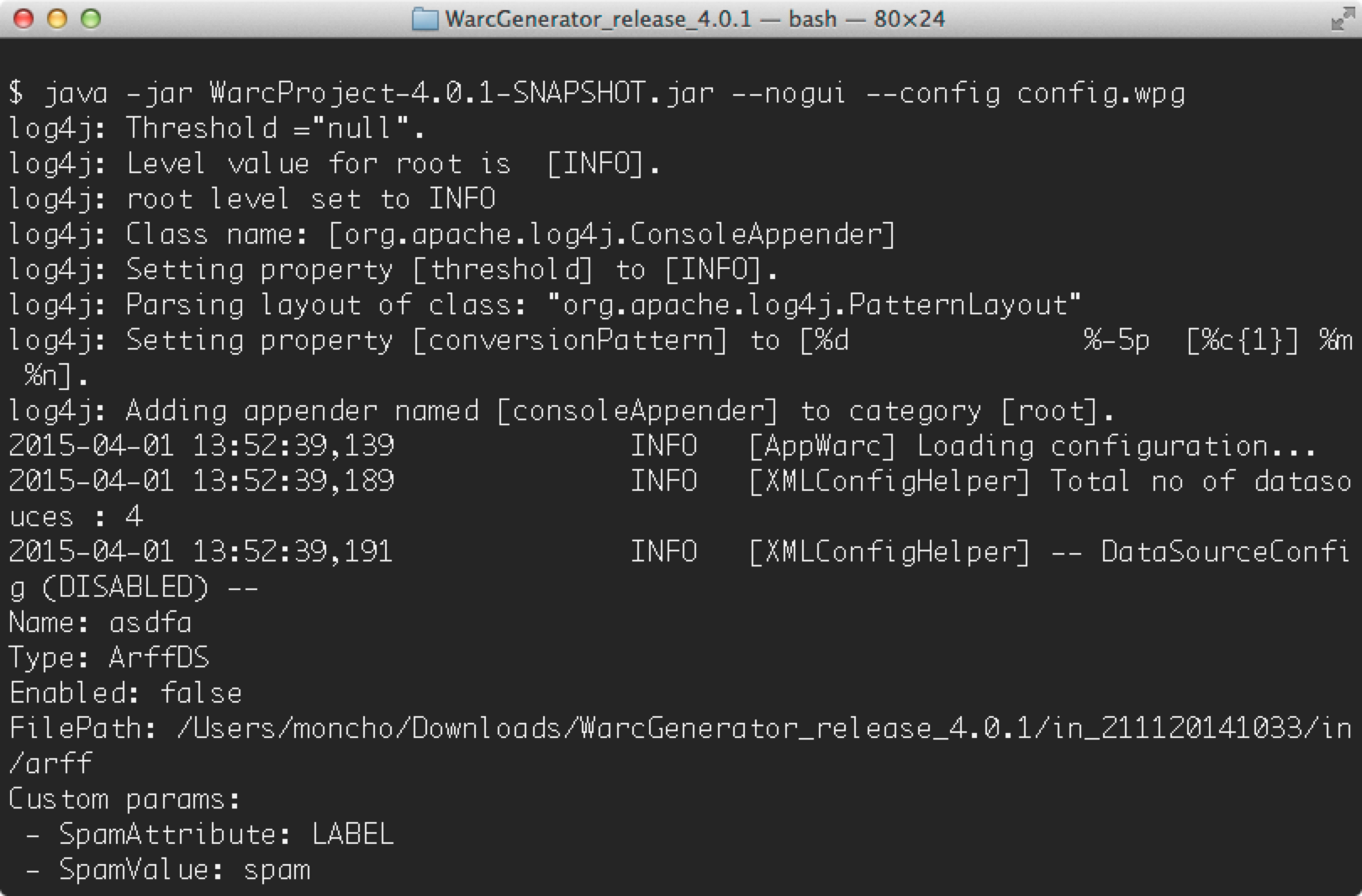 Although an output corpus can be generated using the button "Generate Corpus" located at the right top of the main window, WARCProcessor allows a batch corpus generation method. To this end, user uses the GUI (Graphical User Interface) to generate and save a configuration file (File -> Save as). Then, WARCGenerator can be invoked with the flag --no-gui to work in batch mode.
